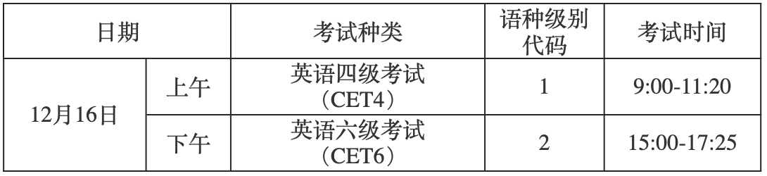 英语四级口语考试(CET-SET4)时间为11月18日(F233次),英语六级口语考试(CET-SET6)时间为11月19日(S234次)。口试采用机考方式进行,我校在南望山校区设立CET-SET考点。具体场次安排如下: