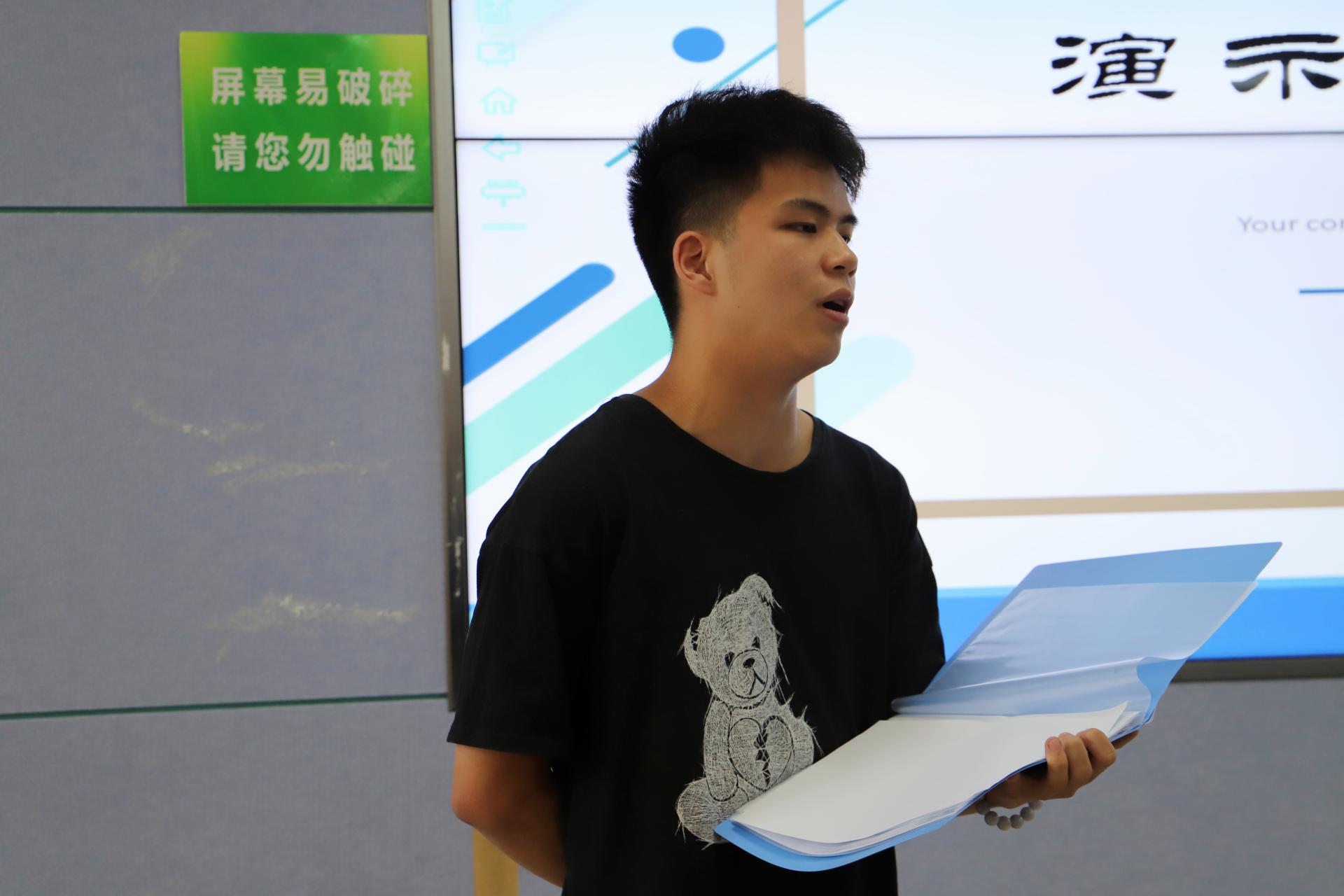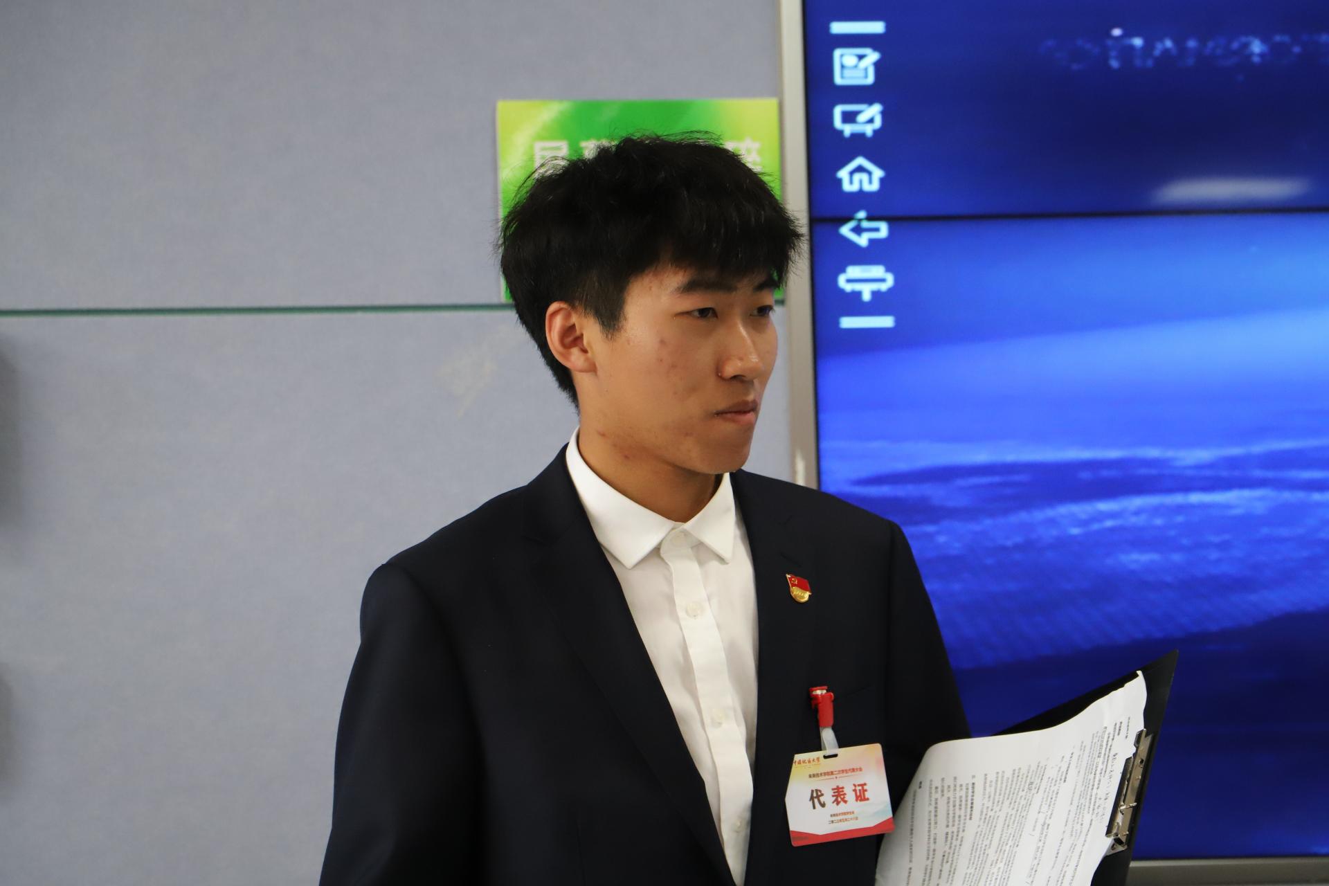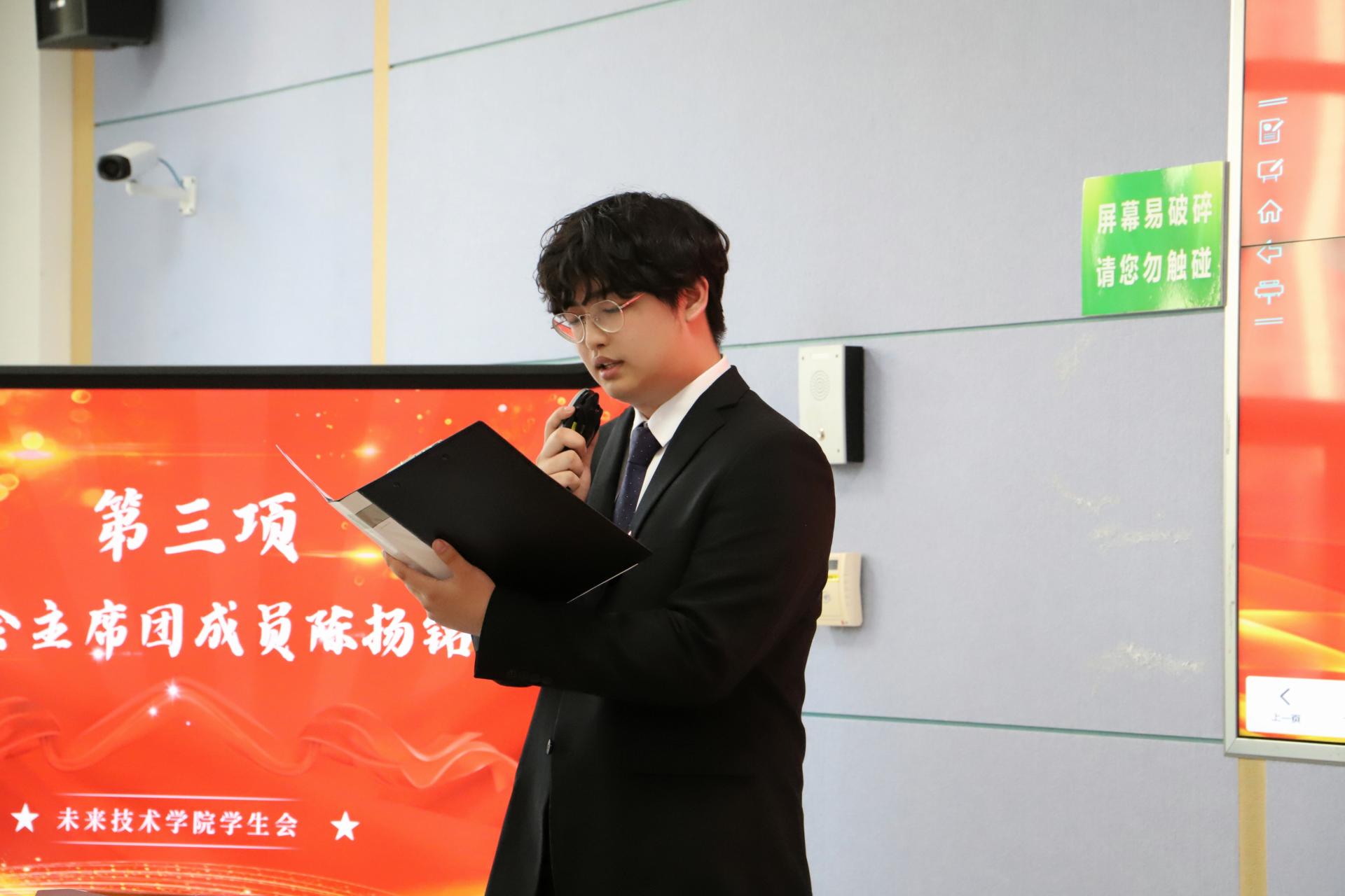 校学生会主席团成员陈扬铭发言。他宣读了校学生会对未来技术学院召开第二次学生代表大会作出的批示,肯定了我院学生会成立以来在各方面取得的建设成效,并对未来工作方向提出建议。