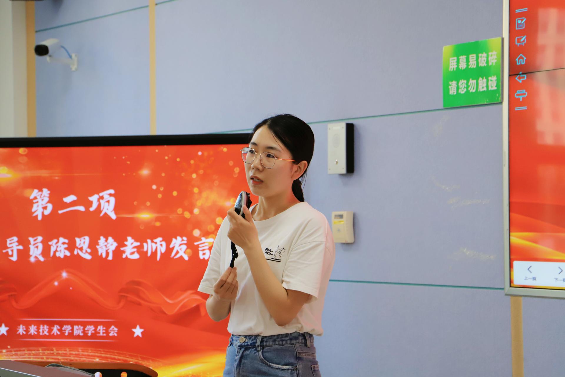 学院辅导员陈思静发言。她表达了对首届学生会全体工作人员的感谢,同时也对新一届学生会建设和发展提出了期待,她希望每一位参加学生会的同学都能围绕服务与成长、友谊与真诚、责任与奉献,不断增长自己的能力和才干,同时为学生会发展与学院建设贡献青春力量。