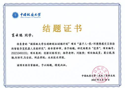 527日至28日,由共青团湖北省委、湖北省科学技术协会、湖北省教育厅、湖北省学生联合会主办,武汉纺织大学承办的湖北省第十四届“挑战杯·中国银行”大学生课外学术科技作品竞赛决赛顺利落下帷幕。未来技术学院2021级本科生葛云聪报送的项目《情投“器”合——情感智能导览机器人算法策略研究》成功入围,并获省级二等奖。