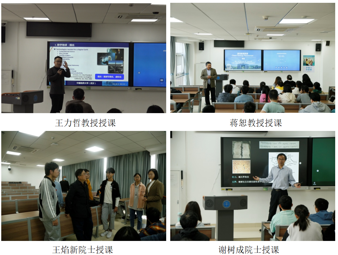 第五讲为计算机学院王力哲教授主讲的《未来技术与遥感》。王力哲教授首先介绍了过往出现的颠覆性科学技术,然后对数字地球和未来遥感技术特别是人工智能与遥感技术的融合进行了详细的讲解。第六讲为资源学院蒋恕教授主讲的《清洁地质能源勘探前沿导论》。蒋恕教授从清洁能源的定义、意义、类型及分布等几个方面对清洁地质能源进行了讲解,然后介绍了国内外清洁地质能源勘探技术的发展现状并对勘探技术未来的发展进行了展望。第七讲为校长王焰新院士主讲的《环境水科学前沿导论》。王焰新院士的授课围绕“水与可持续发展”、“水质与健康”、“可持续安全供水”三个主题展开,首先介绍了水之于地球生态系统和人类社会可持续发展的重要作用,然后举例说明了水质污染对人类健康的严重影响,最后讲解了在当前全球水污染严峻的形势下,如何利用科技创新实现可持续地安全供水。第八讲为地球科学学院谢树成院士主讲的《深时生物与环境演化前沿导论》。谢树成院士首先对研究地球科学需要用到的技术方法进行了总体介绍,然后讲解了团队针对微生物分子“低”、“杂”、“乱”、“源”的问题提出的创新性技术,最后讲解了地质微生物技术在地球科学重大问题中的应用。