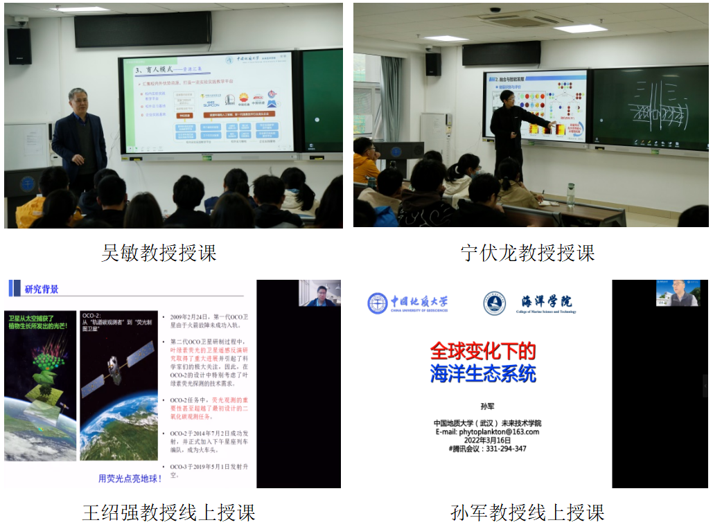 第一讲为未来技术学院吴敏教授主讲的《人工智能前沿导论》。吴敏教授首先从目标定位、技术方向、育人模式三个方面向同学们介绍了未来技术学院的概况,然后针对人工智能的概念、发展、研究内容和领域以及目前的前沿技术进行了深入讲解。第二讲为海洋学院孙军教授主讲的《海洋气候与碳循环前沿导论》。孙军教授首先对海洋的形成、环流以及海水的组成、性质等知识进行了总体的介绍,接着为同学们讲解了当今全球变化下的海洋生态系统的重要性。第三讲为地理与信息工程学院王绍强教授主讲的《陆地表层监测前沿导论》。王绍强教授主要讲解了利用植被冠层叶绿素荧光观测全球地表信息的方法。第四讲为工程学院宁伏龙教授主讲的《海洋资源开发信息融合与智能化发展》。宁伏龙教授从当今海洋资源探索的进展与需求、海洋信息的融合与智能发展、未来发展定位建议三个方面对海洋资源的开发利用进行了讲解。