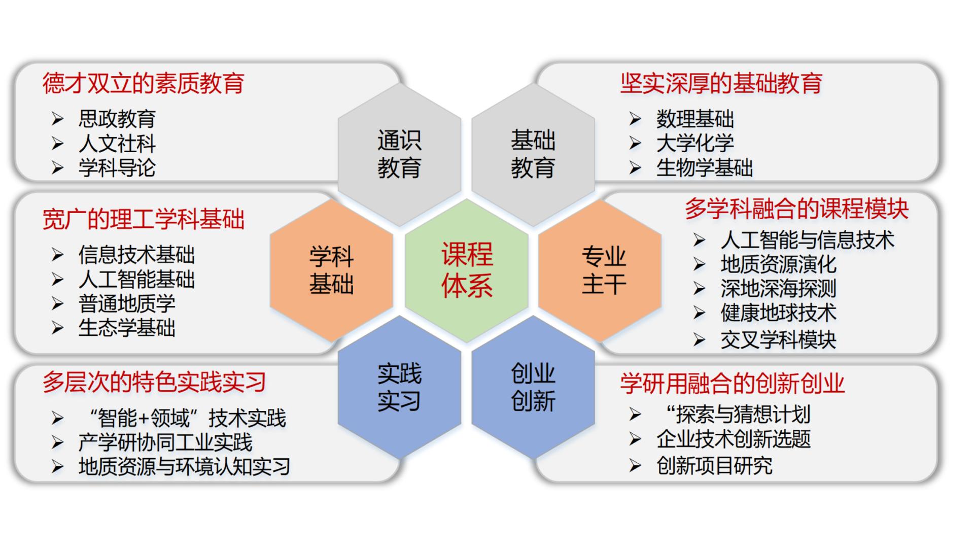 学院汇集学校在地质学、地质资源与地质工程、人工智能、新一代信息技术等领域的优势教学科研资源,打破传统理工专业设置的壁垒,以领域导向型课程体系、能力导向型学习机制、创新导向型实践模式三个创新为载体,以大师引领、科研驱动、资源汇集、国际合作和贯通培养五个维度为抓手,以人工智能研究院、地大科教融合中心、产教融合企业联盟、国际合作研究中心4个平台为基座,构建适应地质资源与环境领域“敢闯会闯”的创新人才培养新范式。