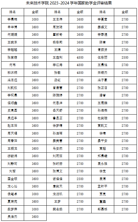 根据本科生院《关于开展2024年国家奖助学金评选工作的通知》《关于2024国家助学金资助等级标准通知》要求,给予特殊困难认定学生给予每人4800元资助(同年度获得国奖或国励为4200元),困难认定学生给予每人3600元资助(同年度获得国奖或国励为3000元),一般困难认定学生给予每人2700元资助(同年度获得国奖或国励为2500元)。