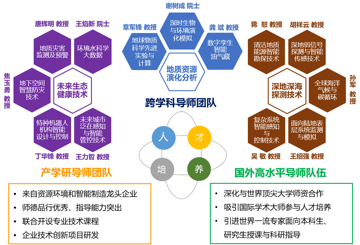 围绕未来地球探测和生态健康技术两大方向,学院聘请殷鸿福、金振民等5位中国科学院院士和2位外籍院士组成顾问团队,聘请王焰新院士、谢树成院士和吴敏教授等16位教授为首席科学家,聘请地质学、地质资源与地质工程、自动化、计算机等领域的高水平师资组成16支导师团队。